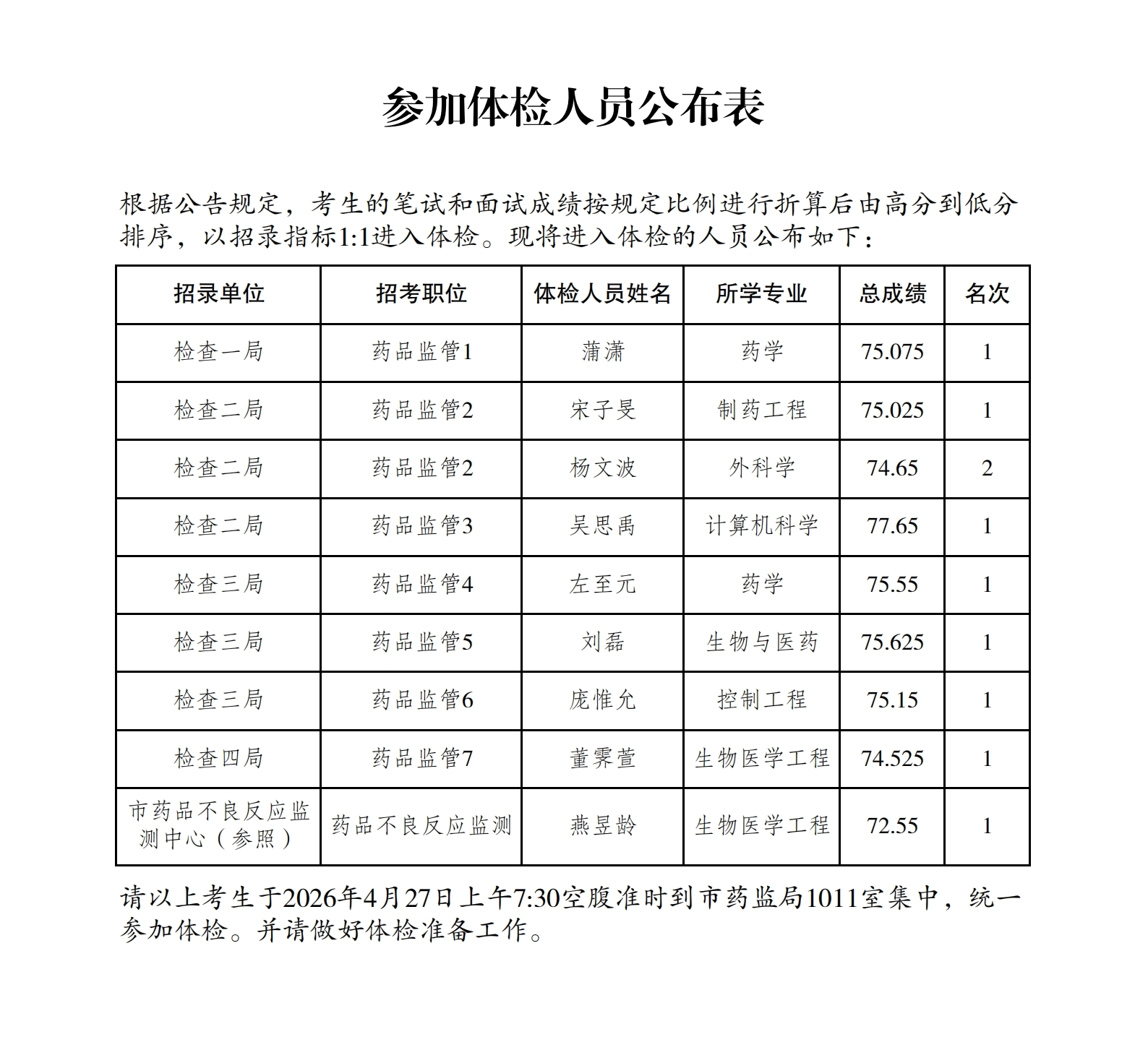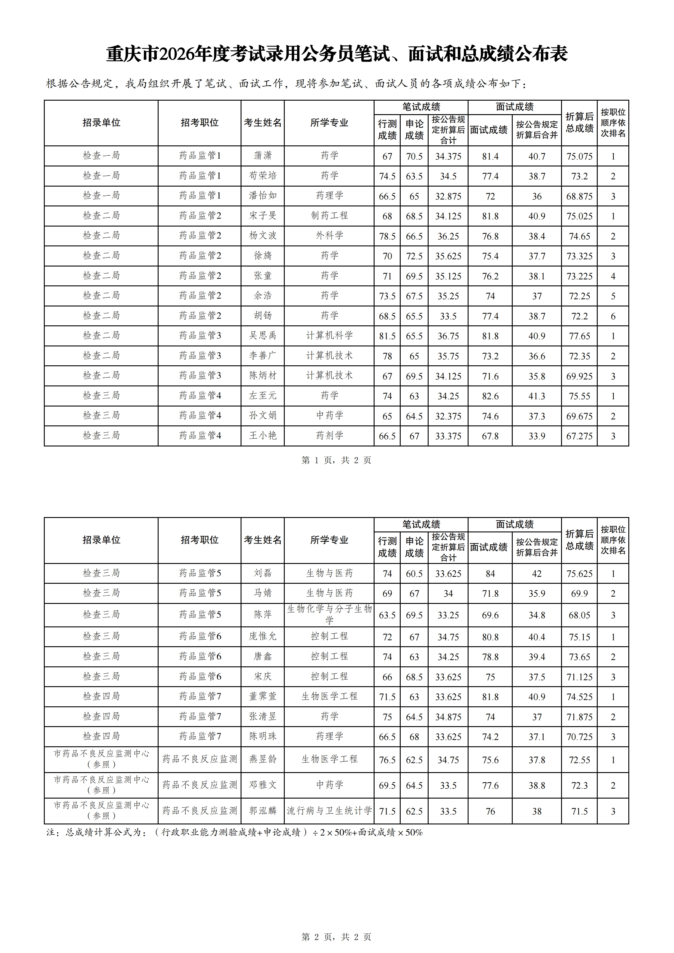 重庆市药品监督管理局2026年公开考试录用公务员成绩及参加体检人员公布